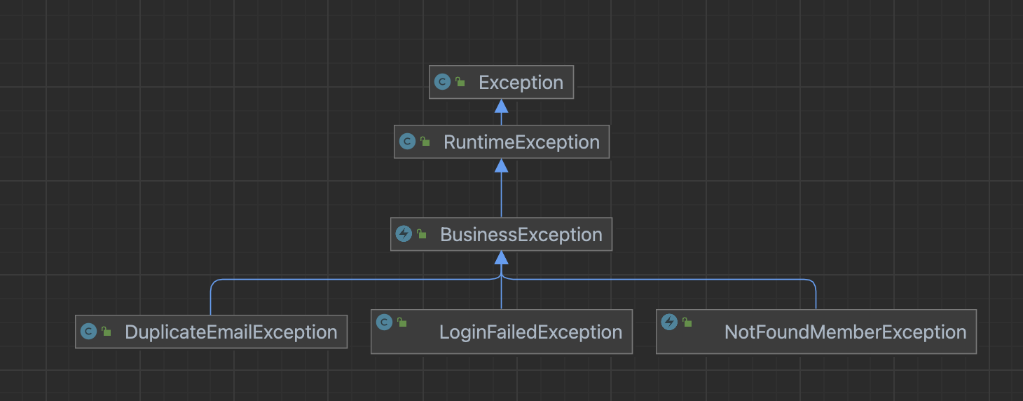 비즈니스 로직 수행 중 발생한 예외는 직접 Exception 클래스를 만들어서 예외를 처리합니다. 유지 보수하기 좋은 코드를 만들기 위해 검증 단계에서 Exception을 발생시켜야 합니다. 예를 들어 회원 가입 기능에서 email 검증 단계에서 Exception을 처리하면 다음 단계에서는 비즈니스 로직만 계속 이어나가면 됩니다.